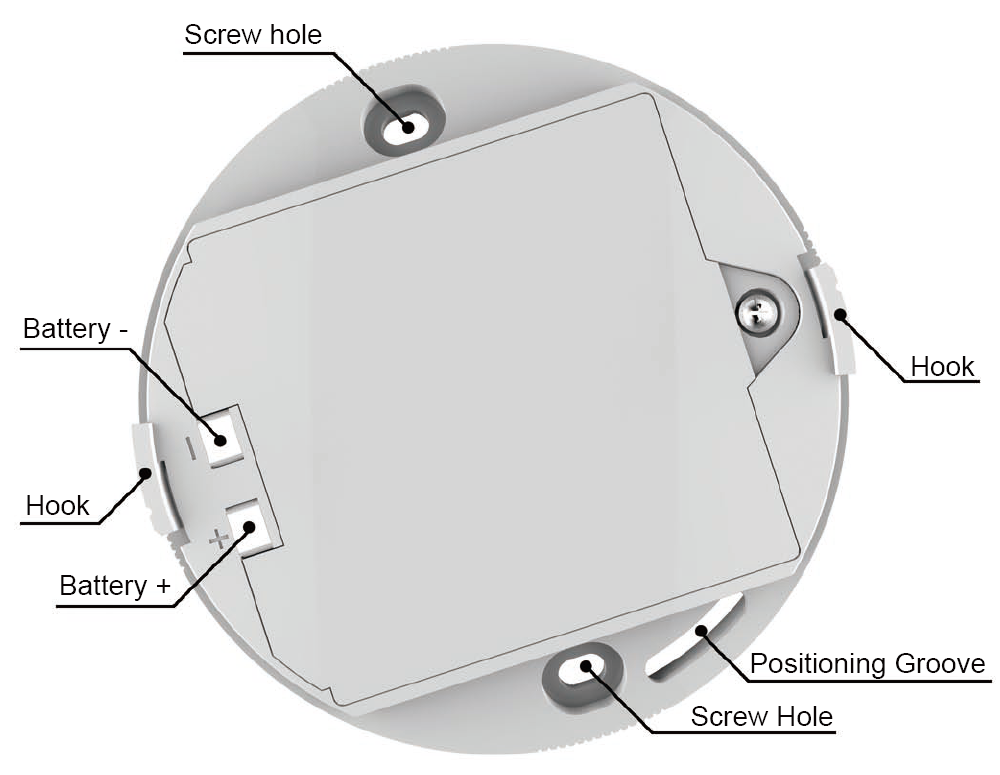 5.22 Insira o gancho da placa de montagem para o slot do alarme, a coluna de posicionamento também deve alinhar com a ranhura de posicionamento. Gire o despertador no sentido horário até que ele se encaixe no lugar.
